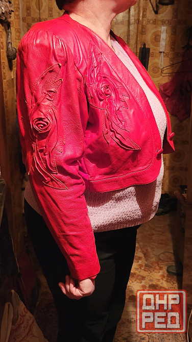 женская весенняя укороченная куртка из натуральной кожи, красная с декором из кожаных розочек. состояние хорошее.