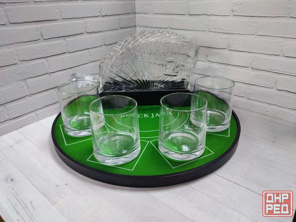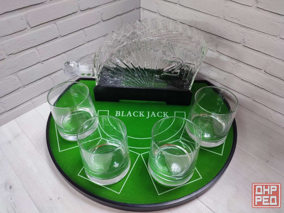 предлагаем вам отличный подарочный набор в виде мини-бара для мужчин, состоящий из оригинального штофа 1 литр, 4-х стаканов по 250 мл и подставки в виде карточного стола для игры в "блэкджек".