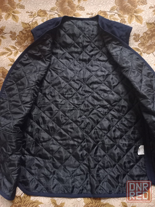 новое состояние, практичная ткань, на пуговицах карманы отсутствуют, темно-синий цвет, 100% полиестер. размер где-то 44, ориентируйтесь на замеры лучше