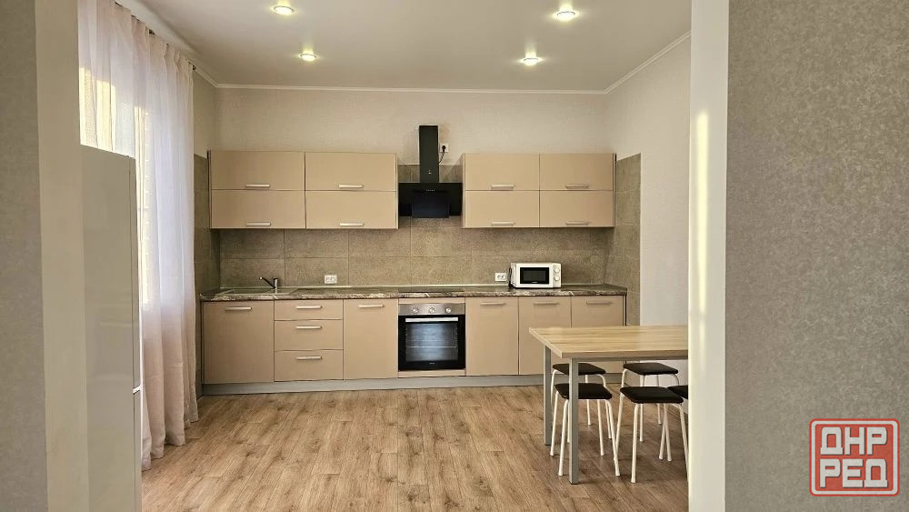 техника: холодильник, микроволновая печь, варочная поверхность, духовой шкаф, вытяжка, телевизор.