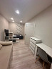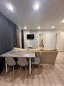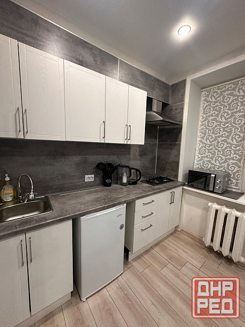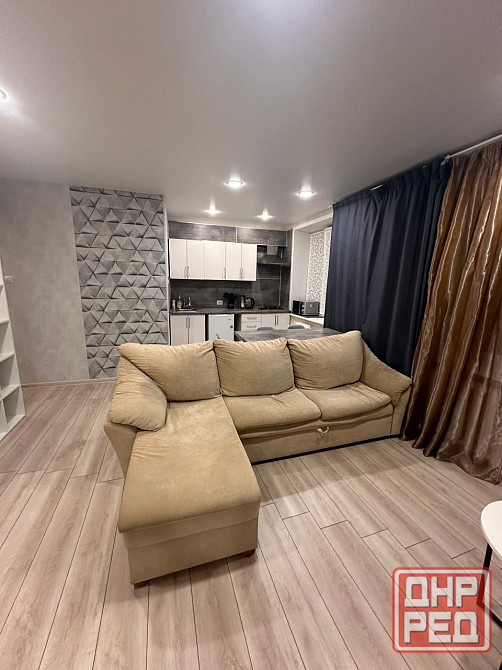 кухня-гостиная с техникой панель, микроволновка, холодильник, большой диван-кровать, зонированный двуспальный диван.
