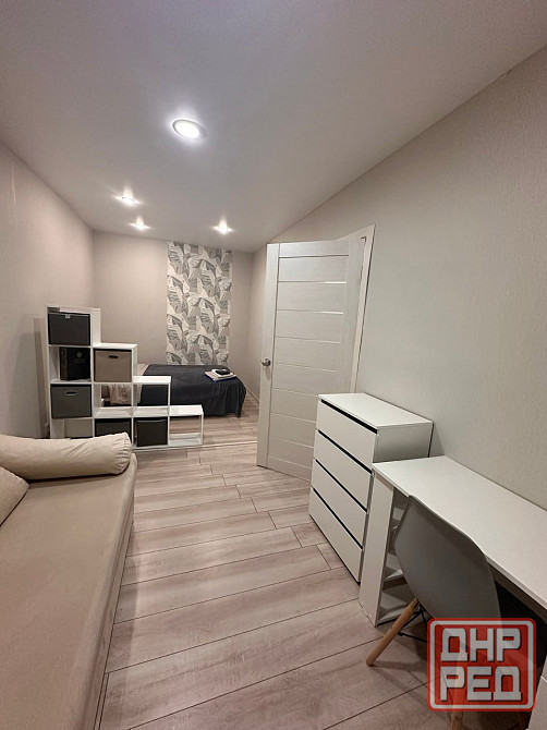 отдельная комната: двуспальная кровать, диван, комод, рабочий стол.