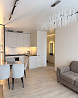 по наполняемости есть все: холодильник, духовой шкаф, плита, микроволновка, кухонные принадлежности, раскладной диван, тв, зеркальный шкаф, места хранения вещей, стиральная машина, обустроенная ванная комната.