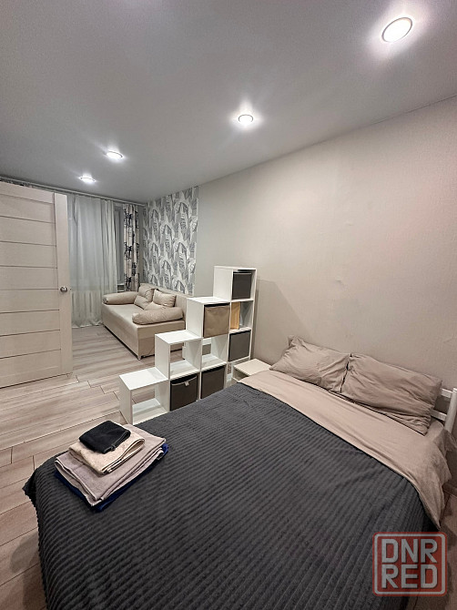 кухня-гостиная с техникой панель, микроволновка, холодильник, большой диван-кровать, зонированный двуспальный диван.