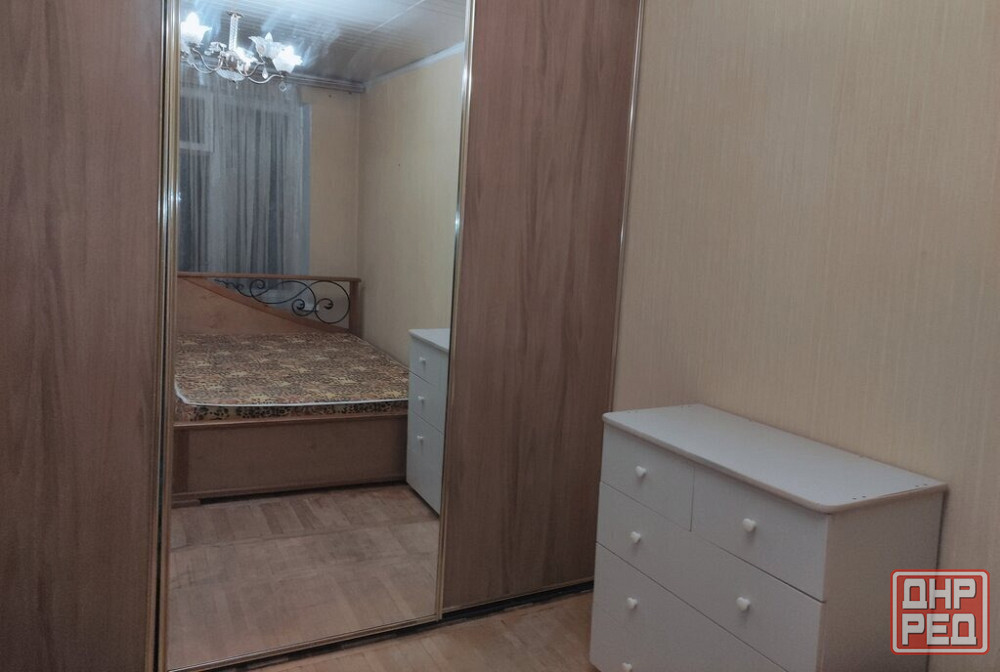 • спальня: оборудована большой кроватью с декоративной спинкой, комодом для вещей и огромным шкафом-купе с зеркальными дверями во весь рост, что визуально расширяет пространство.