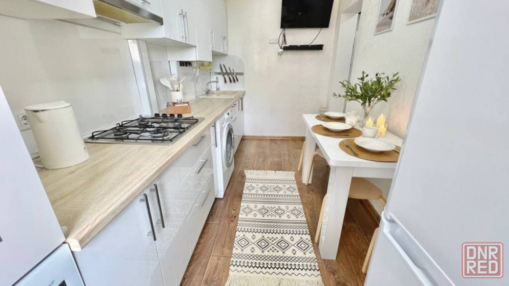 имеется двуспальная кровать и раскладной диван, духовой шкаф, варочная панель, чайник, холодильник.