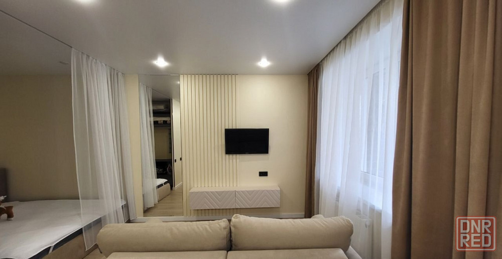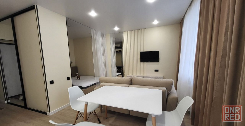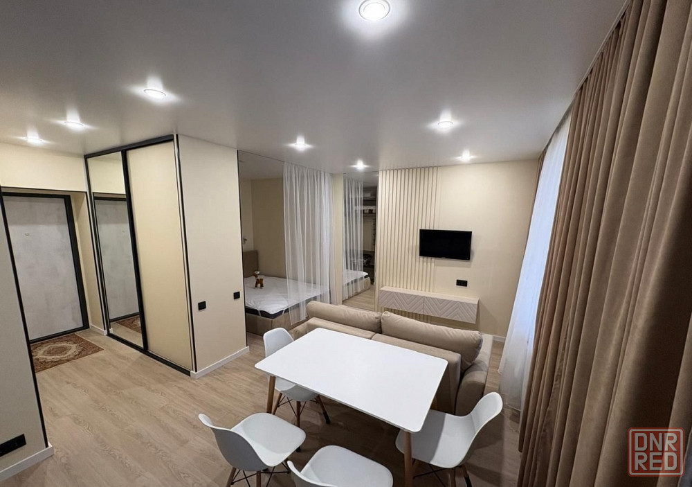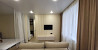 в квартире свежий современный ремонт. есть уютная кухонная зона, гостиная зона с большим телевизором и удобным диваном.