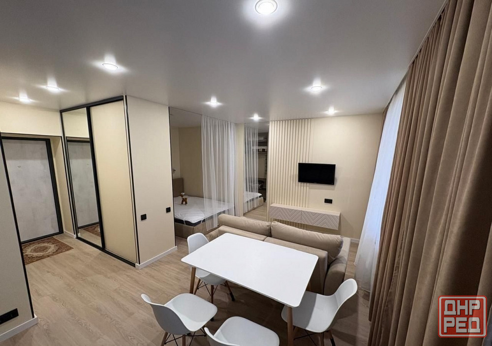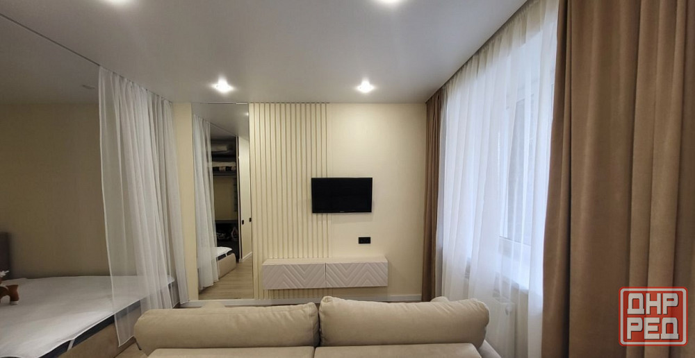 в квартире свежий современный ремонт. есть уютная кухонная зона, гостиная зона с большим телевизором и удобным диваном.