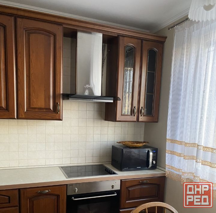 • кухня: элегантный гарнитур из натурального дерева, современная варочная панель стеклокерамика, духовой шкаф, вытяжка и микроволновая печь.