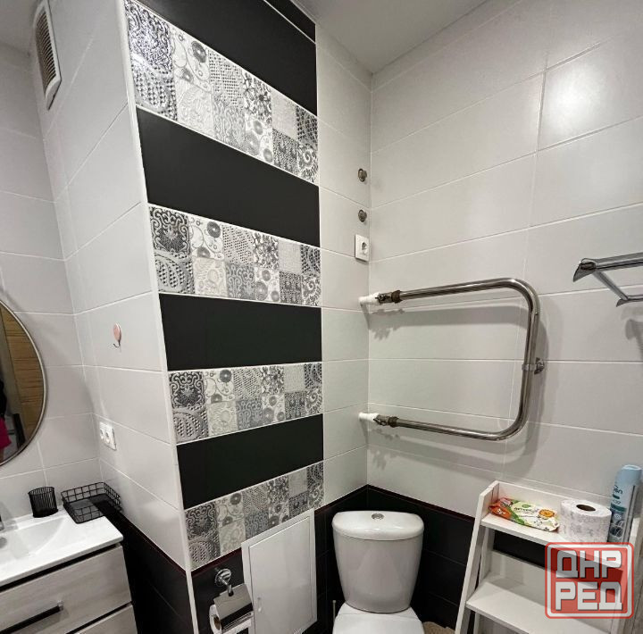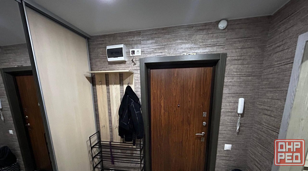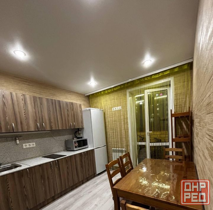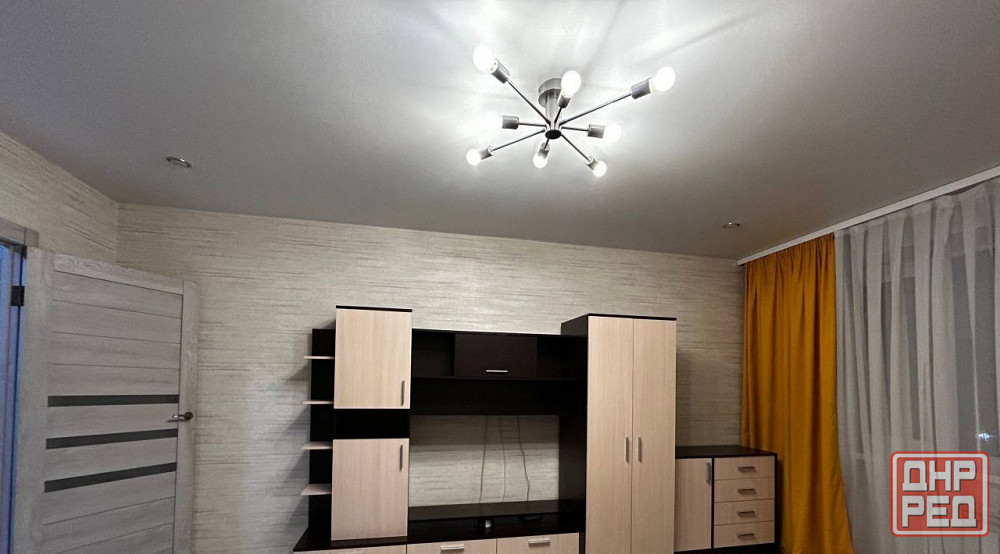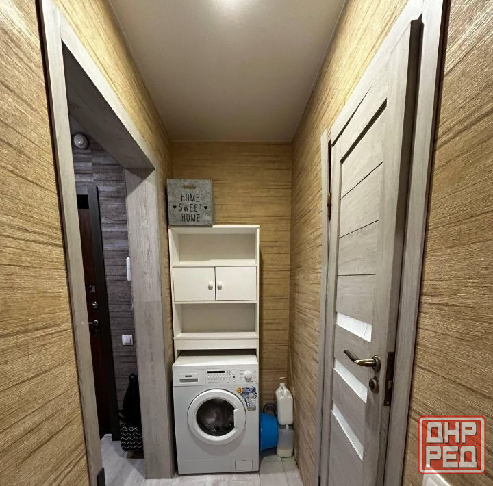 есть вся необходимая мебель и техника:двуспальная кровать с новым матрасом, шкаф-купе, полностью укомплектованный кухонный гарнитур и санузел. также установлен бойлер на фото его не видно, вода подается по графику.