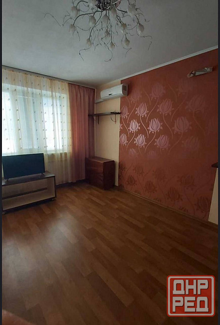 • вторая комната гостиная: светлая и уютная, установлены кондиционер и телевизор. приятный дизайн стен с цветочными акцентами.