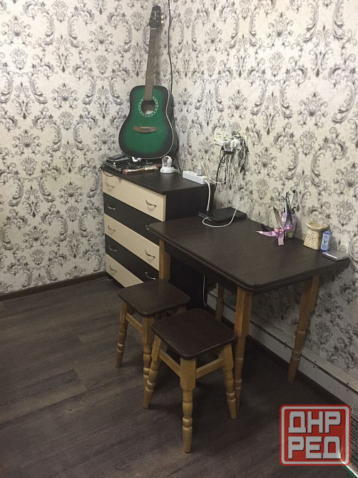 • комнаты: в одной комнате стоит раскладной диван, в другой — небольшой рабочий стол и комод.