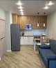 кухня укомплектована техникой духовой шкаф, варочная панель, холодильник, чайник, микроволновая печь, удобная рабочая поверхность.