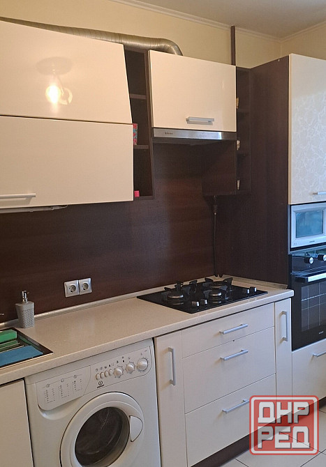 из мебели: кухонный гарнитур, холодильник, плитка с духовой печью, стол и стулья, электрический чайник и посуда, диван-кровать, кровати, шкафы и т.д.