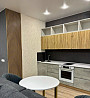полностью оборудованная кухня: плита, холодильник, микроволновка, кухонный гарнитур.