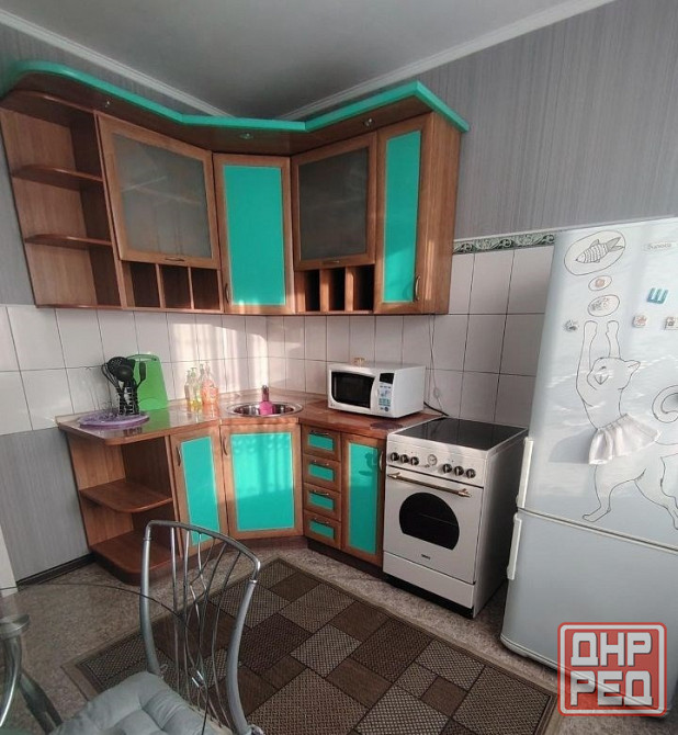 из мебели: кухонный гарнитур, холодильник, плитка с духовой печью, стол и стулья, электрический чайник и посуда, диван-кровать, шкафы и т.д.
