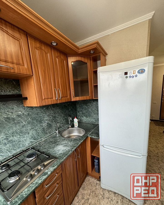 из мебели: кухонный гарнитур, холодильник, плитка с духовой печью, стол и стулья, электрический чайник и посуда, диван-кровать, шкафы и т.д.