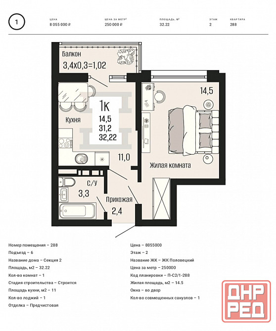 Общая площадь: 32.2 м2
