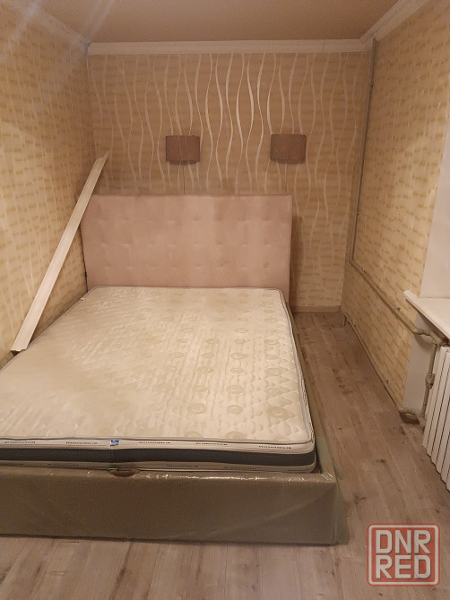 в спальной комнате кровать в упаковке и встроенный шкаф