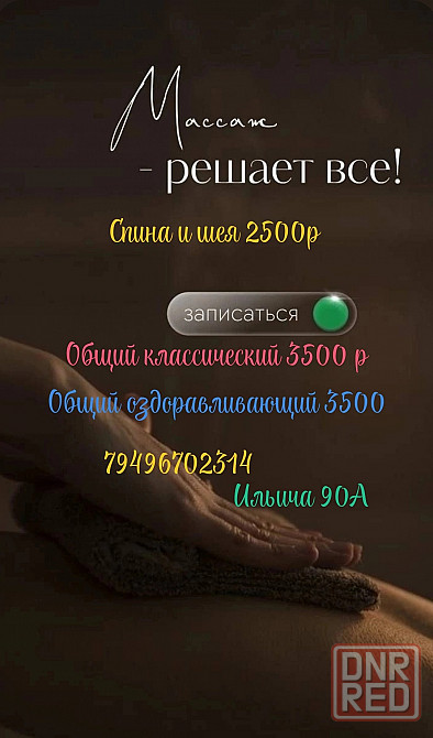 сидячая работа в одном положении? мышцы забились после интенсивных тренировок? или просто болит спина? добро пожаловать ко мне на стол! оздоравливающий массаж - улучшит тонус мышц, разгонит лимфу или молочную кислоту, снимит спазмы, выведет соли, токсины, шлаки и лишнюю жизкость избавитесь от спазмов, отеков, спаек, рубцов и уплотнений, улучшите гибкость связок, восстановитесь после травм.