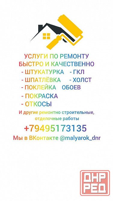 ремонтно строительные и отделочные работы под ключ. оконные рюоткосы под ключ. гипсокартон, штукатурка, шпаклёвка по дюобои, шпаклёвка под покраску, стеклохолст, обои. стяжка, ламинат, линолиум, кварцвинил. и многое другое. всё работы делаю сам. качественно профессионально. опыт 25 лет. прайс мастер днр. моя группа в вконтакте @malyarokdnr. +79495173..📲 владимир