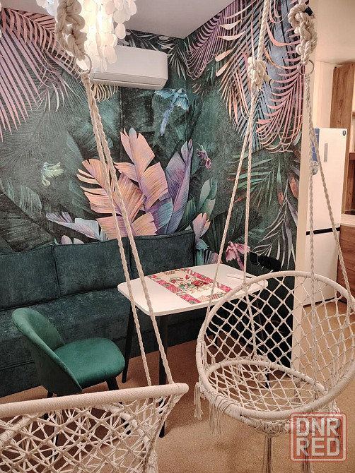 кухня оснащена всем необходимым: холодильник, плита, микроволновая печь и стиральная машина. в гостиной зоне есть удобный диван и подвесные кресла, которые идеально подходят для отдыха.