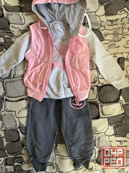 продам спотривный костюм для девочки 1,5 - 2 года. состоит из свитшота кофты, штанов и жилетки. внутри тоненький начесик. новый, костюм не носили.