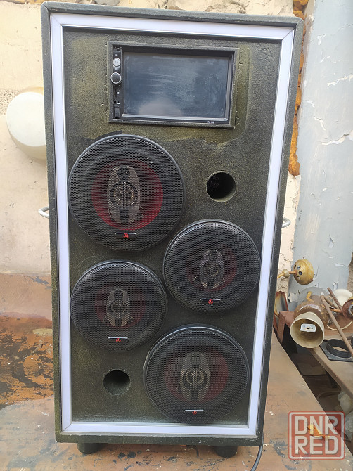 продам самодельную блютуз колонку.колонка собрана в деревянный короб от ас90.короб был покрашен,не стал перекрашивать.вставлена 7дюймовая автомагнитола,автодинамики 10 и 13.есть светомузыка.пульты на магнитолу и на светомузыку есть.была собрана для гаража и улицы.питание 220 вольт.