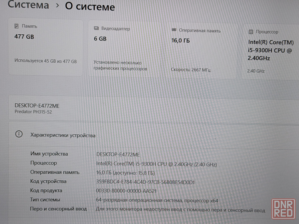 acer predator helios 300 ph315-52-504e. ноутбук в отличном состоянии. батарея без износа. диагональ экрана 15,6 дюйма. экран матовый, разрешение 1920х1080 full hd, частота 120 гц. хороший звук. отличный вариант для работы, учёбы, интернета, игр. клавиатура с подсветкой. процессор i5-9300н, оперативная память 16gb ddr4, ssd 512gb. установлена лицензионная windows 11. интегрированная видеокарта intel uhd graphics graphics 630, дискретная nvidia rtx 2060 6gb gddr6. посмотреть можно в центре макеевки. не пересылаю!