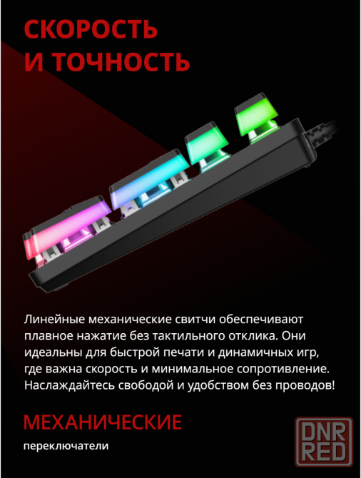 механическая клавиатура с негромкими красными свичами.широкие откидные ножки. резиновые накладки. клавиатура типа скелетон с матовыми подсвечивающимися кейкапами rgb подсветка. регулируемая подсветка. компактное расположение клавиш. металлическая верхняя панель