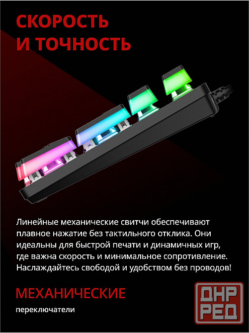механическая клавиатура с негромкими красными свичами.широкие откидные ножки. резиновые накладки. клавиатура типа скелетон с матовыми подсвечивающимися кейкапами rgb подсветка. регулируемая подсветка. компактное расположение клавиш. металлическая верхняя панель