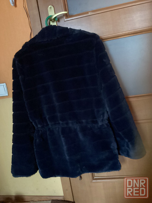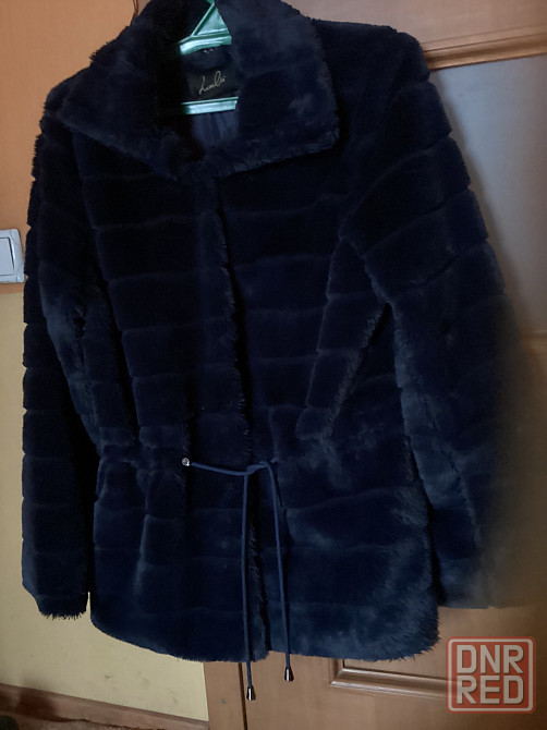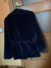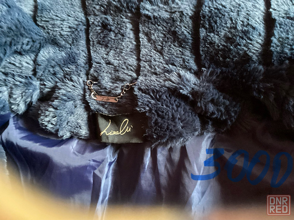 качественный искусственный мех синего цвета, на внутреннем пояске, ниже бедер. р48