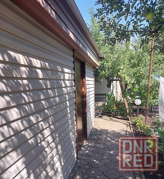 во дворе гараж, обшит сайдингом.