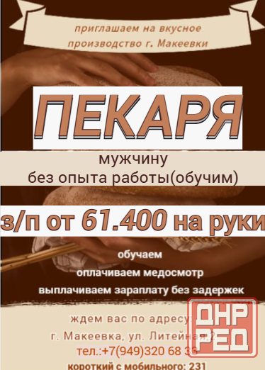 хлебозаводу в г. макеевка требуется кондитер-пекарь, желательно мужчина: