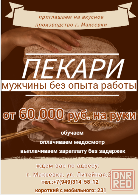 на хлебобулочное производство г. макеевки приглашаем мужчин на вакансию пекаря.