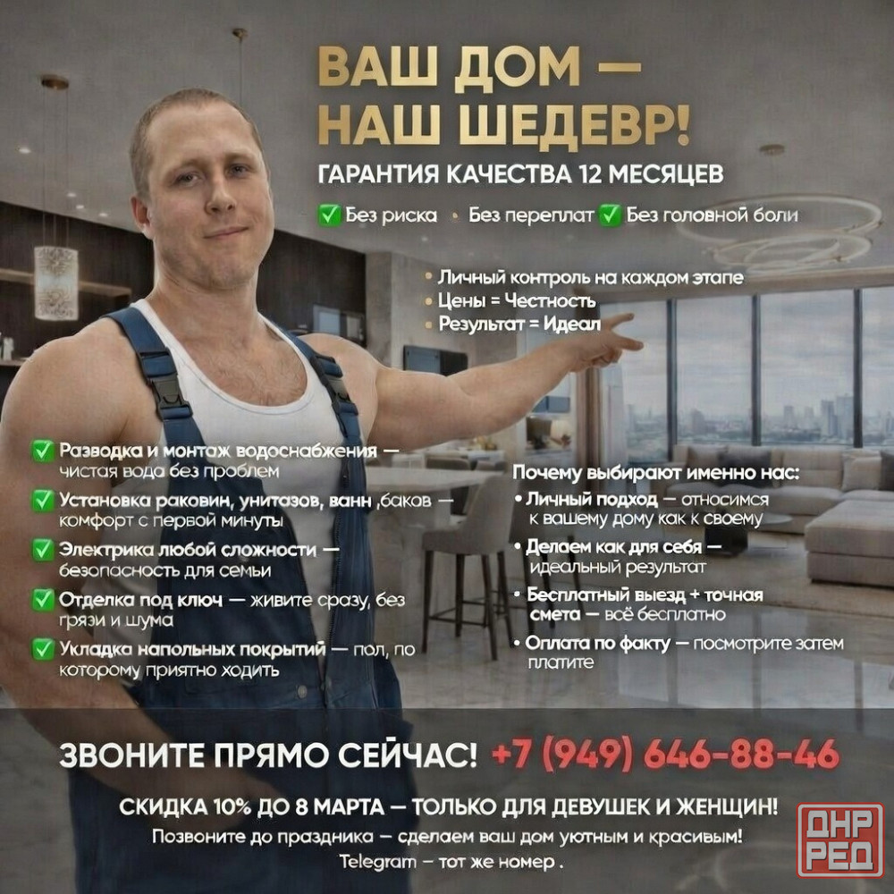 ✅ отделка под ключ: выравнивание стен/полов, штукатурка, шпатлёвка, плитка, обои, покраска, потолки, ламинат/линолеум