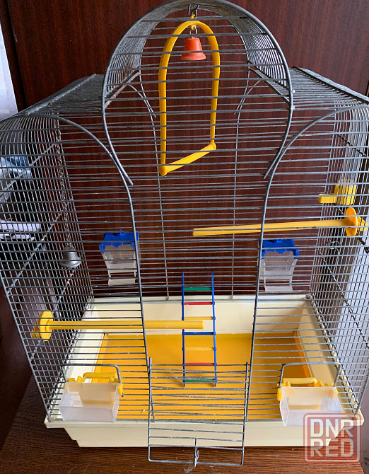 продаю клетку для птиц с выдвижным поддоном, кормушками, поилкой, пластмассовыми палочками, качелями, лестницей, калокольчиками.
