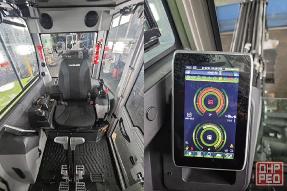 кабина оператора. сертифицирована по стандартам rops/fops защита при опрокидывании и от падающих предметов. в ней есть эргономичные джойстики, регулируемое кресло и система климат-контроля.