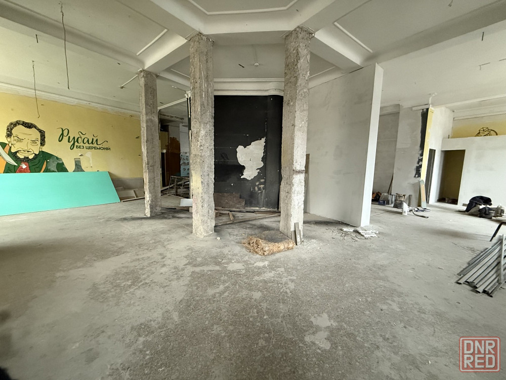 просторное помещение площадью 180,4 м² с высокими потолками и естественным освещением. пять больших витражных окон и два входа создают ощущение простора и уюта.
