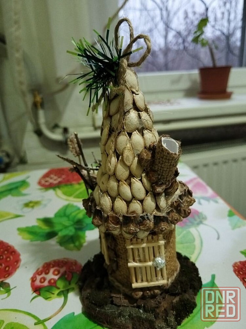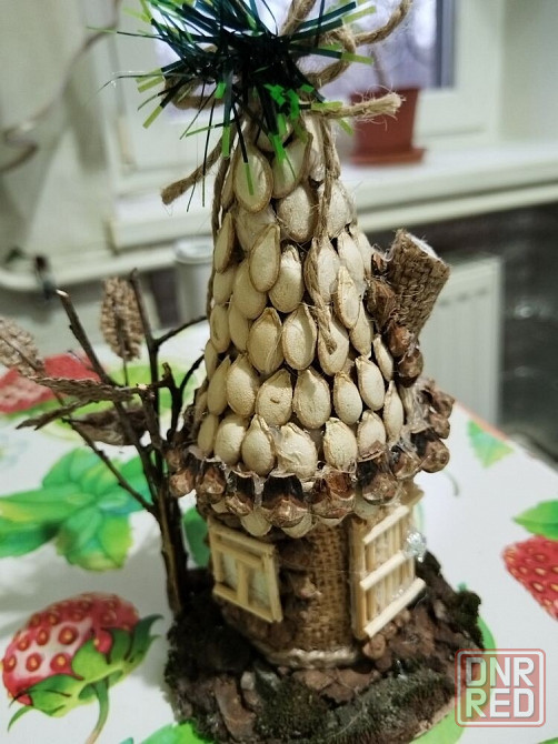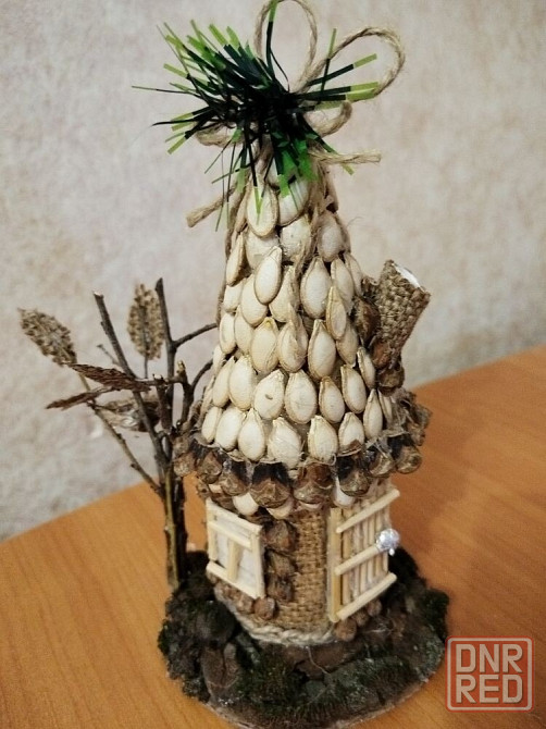 декоративная игрушка "избушка". ручная работа. высота 15 см, сделан из картона, мешковины и природных материалов. доп. см. фото. лот находится в г. стаханов лнр.