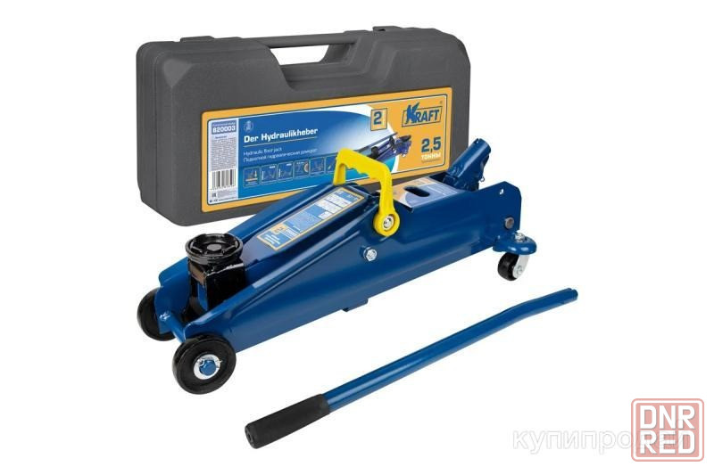 подкатной гидравлический домкрат kraft 2.5 т, кейс kt 820003 предназначен для плавного поднятия автотранспорта на высоту до 385 мм.